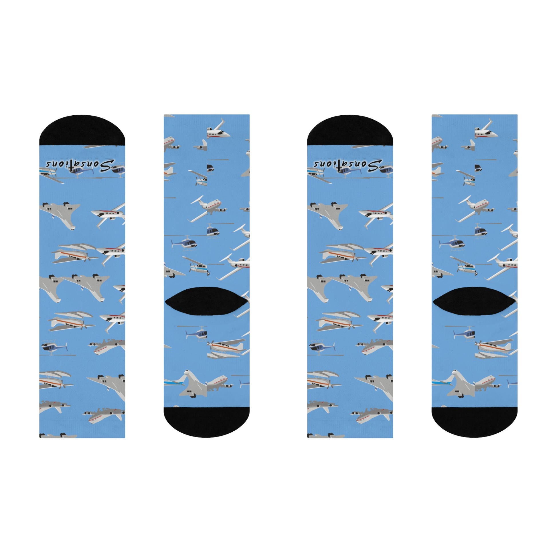 Slide these cushioned crew socks on and feel like you're stepping onto the tarmac of a sunny airfield. Sky-blue fabric scattered with small, detailed airplane illustrations brings a playful, aviation-themed energy to everyday wear. The socks' soft stretch hugs the calf without squeezing, while extra padding underfoot keeps long walks, standing shifts, or travel days comfortable. Wear them under casual jeans, with a flight-jacket vibe, or tucked into boots for a subtle nod to flight fandom. They read as thoughtful, wearable pieces for anyone who loves planes, travel, or vintage aeronautical style — bright, lively, and quietly confident in their details.